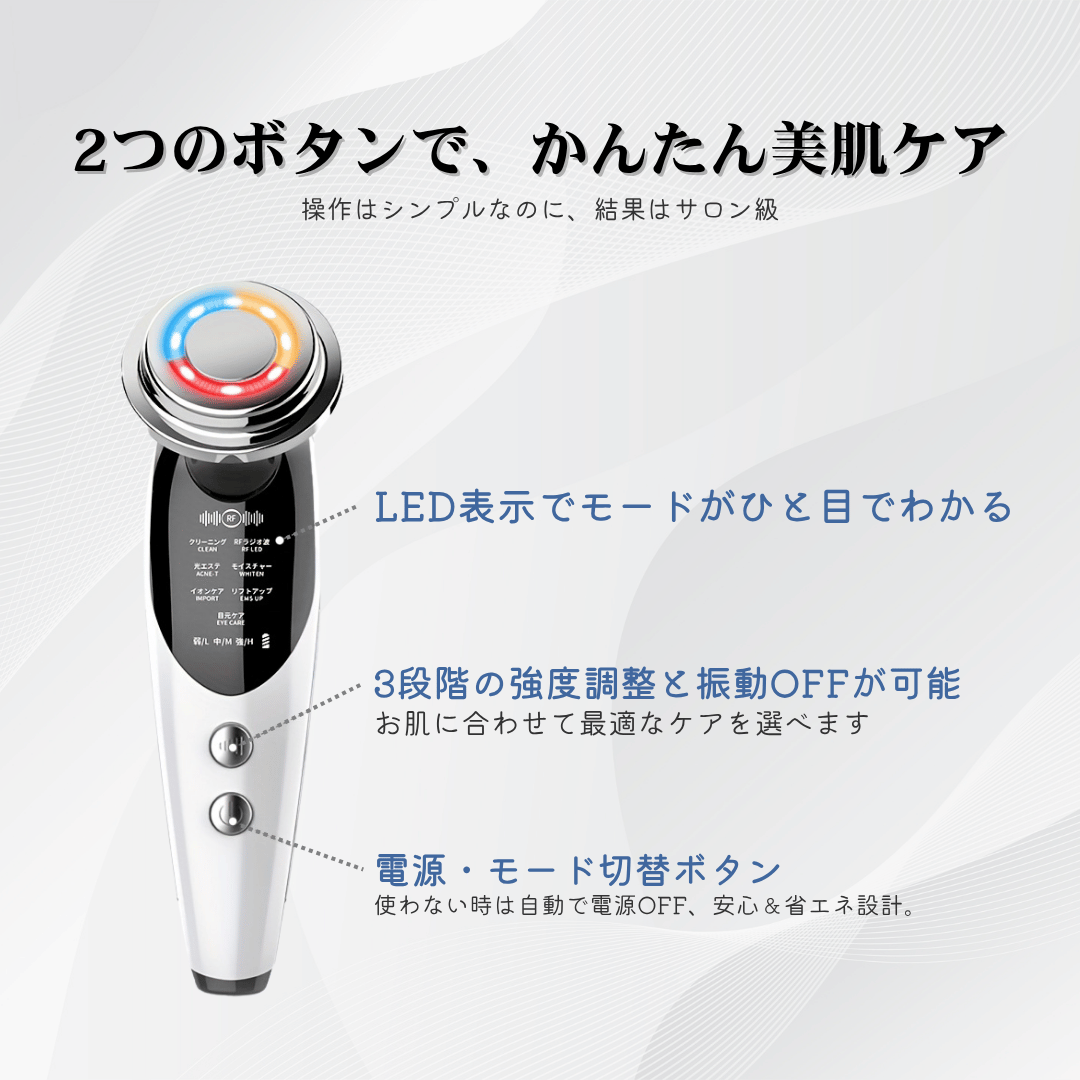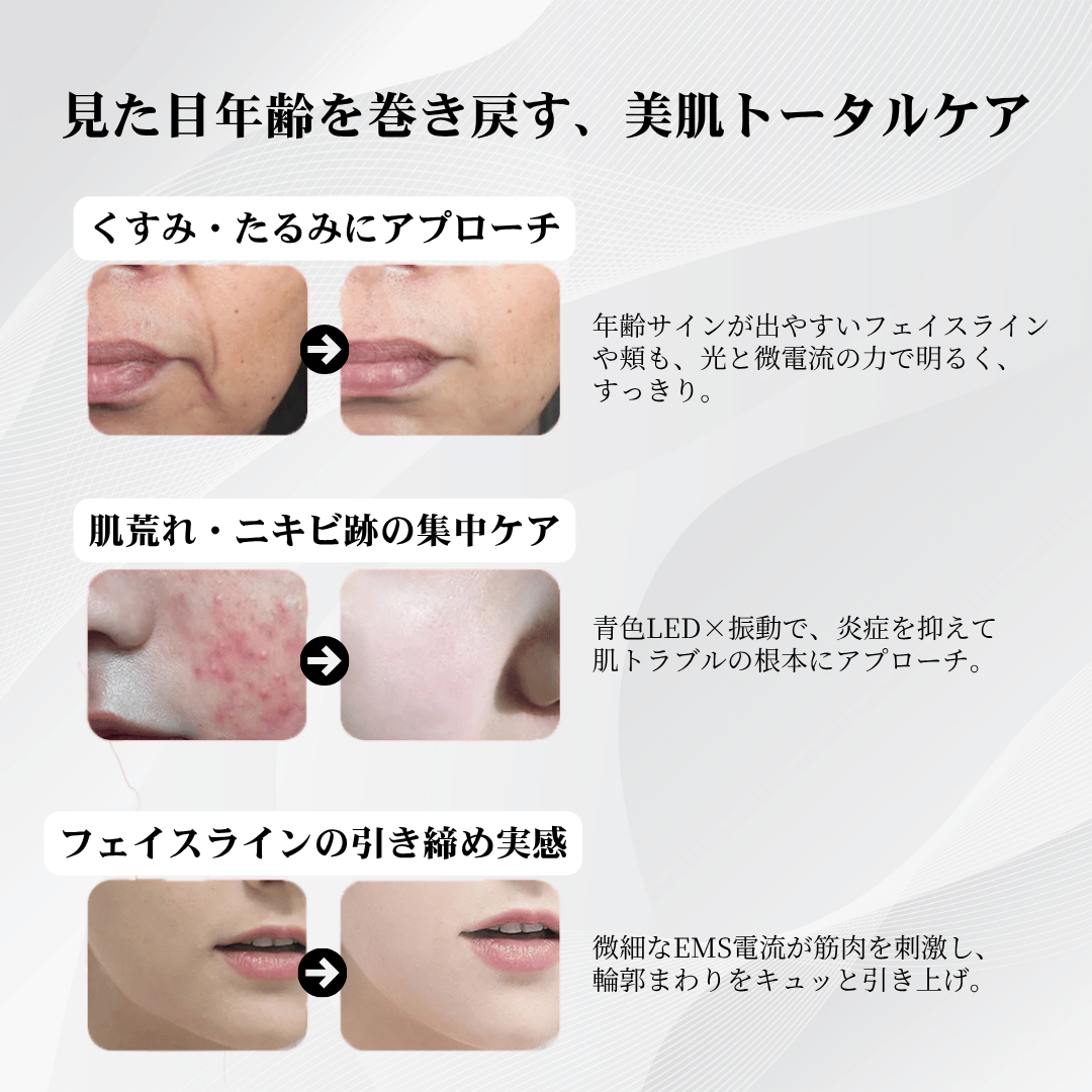 1台で「リフトアップ」「シワ改善」「くすみケア」「毛穴引き締め」「ニキビ対策」まで全部こなす、まさに“おうちエステの決定版”。