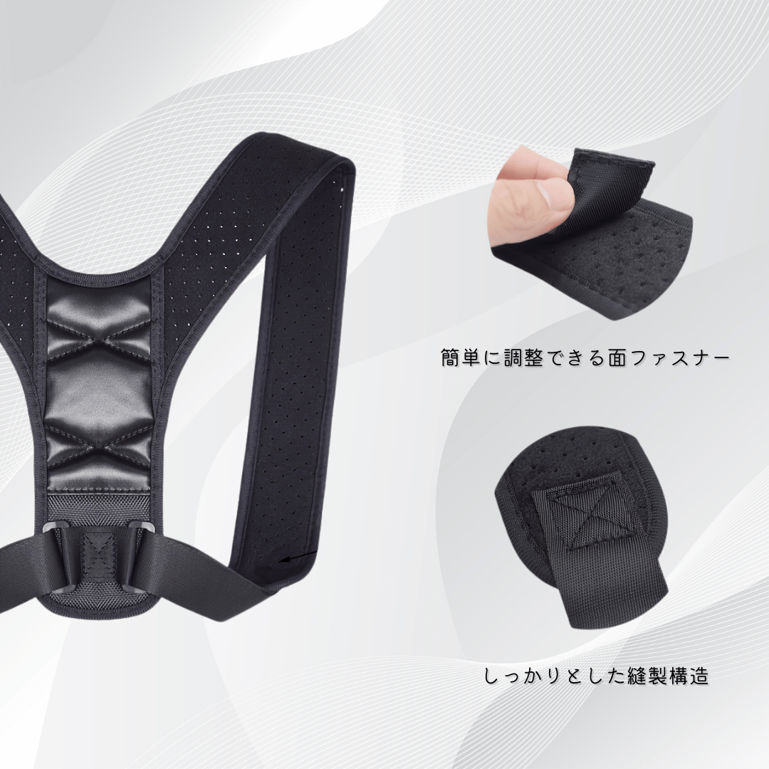 ■ 商品仕様・用途:背中・肩まわりの姿勢サポート用・素材:ベルベット高密度スポンジナイロンウェビング(ナイロン製ベルト部分)※肌に触れる部分にはやわらかい素材を使用しています。・サイズ展開:S / M / L / XL※詳細な対応寸法は記載なし。・デザイン仕様:矢印ヘリンボーンサポート構造(背面に矢印状のサポートラインを配置したデザイン)・主な機能:姿勢サポート通気性設計快適な装着感